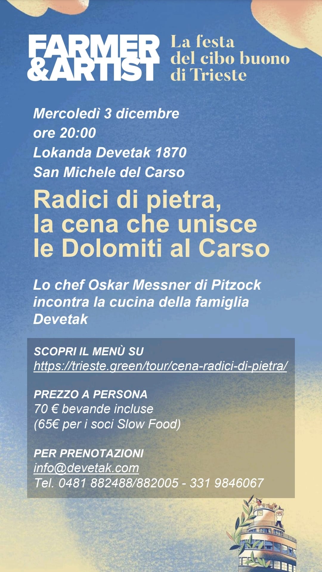 Vse potrebne informacije (meni, vina ipd) so na sledeči povezavi:  https://trieste.green/tour/farmer-artist-2025-cena-radici-di-pietra/#menu